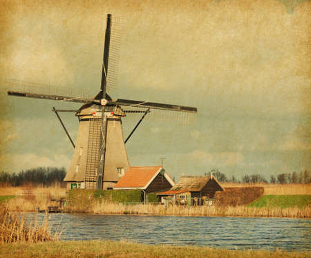 View of windmill at Kinderdijk, Netherlands. Photo in retro style. Paper texture.