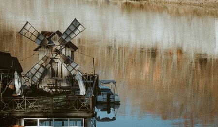 Windmill river farmland scene. windmill river. Windmill river farm view. WIndmill at river.