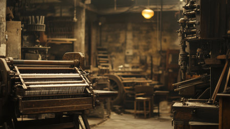 A captivating view of an old workshop filled with vintage machinery and tools. The rustic atmosphere evokes a sense of history and craftsmanship in industry.