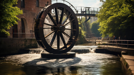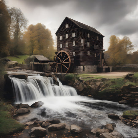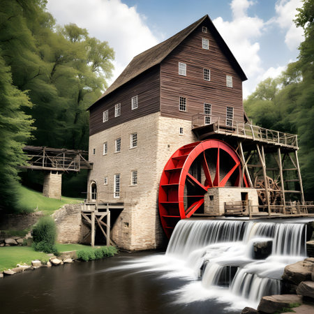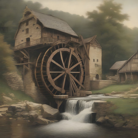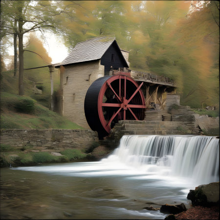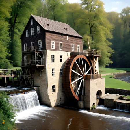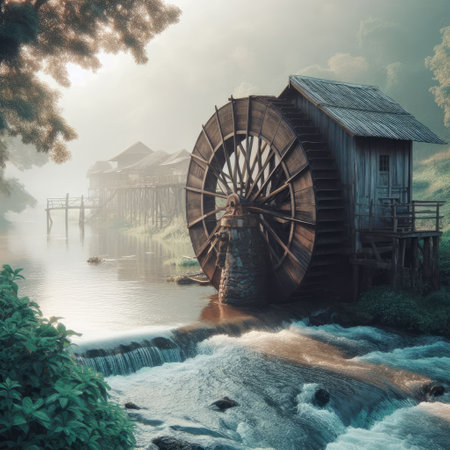 Scenic watermill beside a stream in a lush green landscape with morning sunlight.
