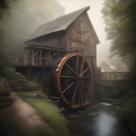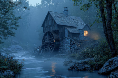 A tranquil scene featuring a rustic watermill softly illuminated under a luminous moon, shrouded in delicate mist amid dense, shadowy woods.
