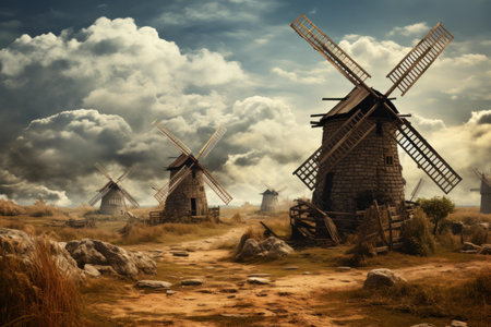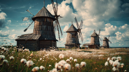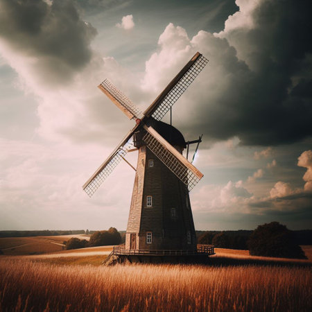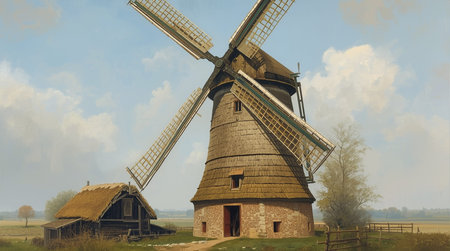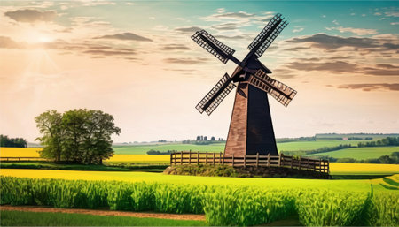 A picturesque windmill stands tall amidst green fields under a bright sunny sky, symbolizing traditional rural life.. AI Generation