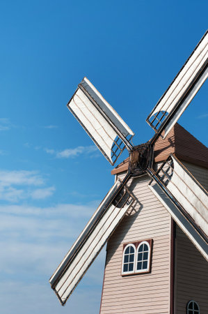 A windmill against a background of blue sky and clouds on the island of Saaremaa.