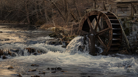 Old stone watermill building with a chimney and water wheel is standing on the edge of a river running through a forest