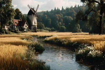 A picturesque rural scene showcasing a charming windmill beside a flowing river, surrounded by golden wheat fields and dense green forests under a partly cloudy sky, epitomizing pastoral tranquility. Generative AI