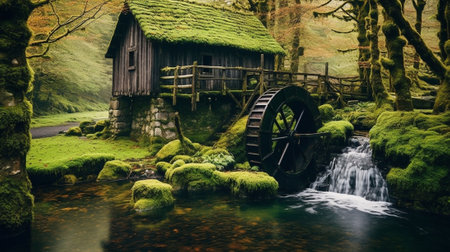 Generative AI : Ancient water mill mossy ruins in Fragas do Eume natural park Galicia Spain