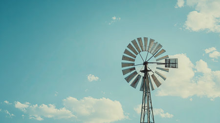 A close-up of an old-fashioned windmill on the prairies of Kansas. No people, copy space.