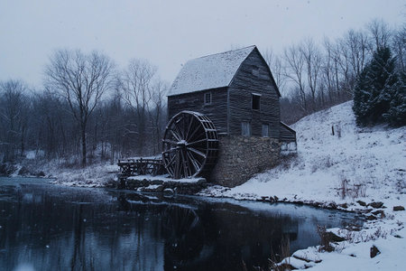 Soft snowflakes gently fall on a rustic water mill nestled by a serene pond, creating a tranquil winter landscape. Bare trees surround the area, enhancing the peaceful ambiance.