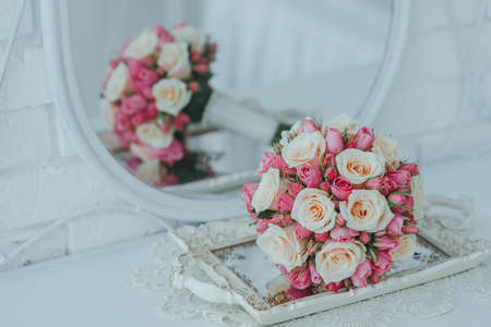 Wedding rose bouquet on a antique mirror