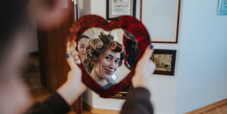 Girl with curlers in a heart-shaped mirror frame at home, playful and stylish moment