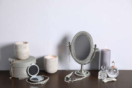 Small mirror, perfume bottles and jewelry on wooden table near light wall