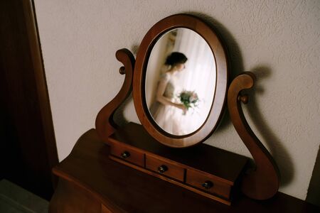 Reflection of the bride with a bouquet in her hands in an old mirror on the table for make-up