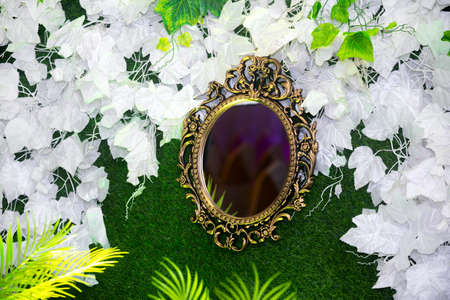 Green artificial grass based wedding stage with handcrafted oval-shaped vanity wall mirror decoration background. Plastic artificial flower. Wedding decoration.