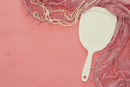 Top view image of vintage hand mirror and delicate female romantic scarf.