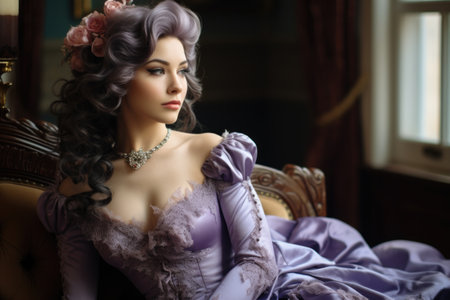 Portrait of beautiful young woman in purple dress sitting on the bed