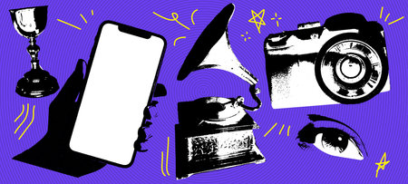 Collage elements set featuring glass, gramophone, eye, camera, and phone. Vintage pop art with purple background, torn paper, halftone texture, and retro vector cutouts.