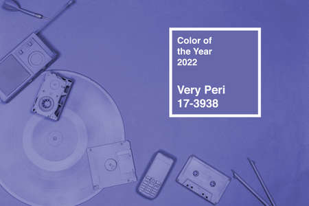 Very peri. The color of the year 2022. Retro VHS video cassettes on color background. Highly popular old video technology from the 80s and 90s.