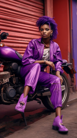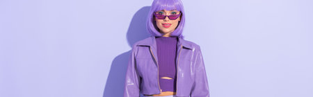 Beautiful fashionable girl purple hair fashion posing glamor yellow background unaltered