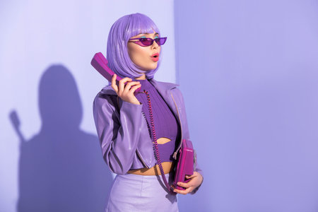 amazed young woman dressed in doll style with retro telephone on violet colorful background