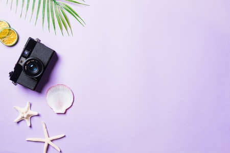 Top view flat lay mockup of camera films, shells, leaves, starfish beach traveler accessories on a purple background with copy space, Business trip, and vacation summer travel concept