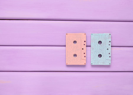 Color audio cassettes on a pastel wooden background. Retro audio technology. Trend of minimalism.