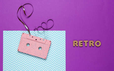 Music lover minimalism concept. Retro style 80s. Pink audio cassette with film on a blue purple paper background with word retro.