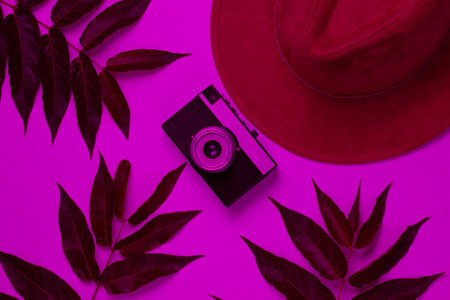 Autumn travel. Woman's felt hat, retro camera in pink neon light with green leaves. Top view