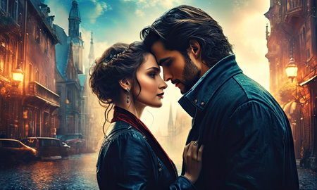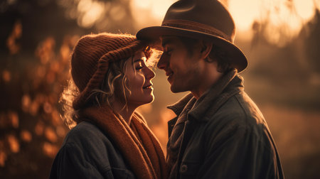Young man in vintage hat gently holding girlfriends face and going to kiss her standing near the road at the dawn Beautiful couple in love cute hugging outside enjoys rom : Generative AI
