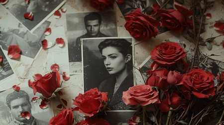 A Detailed Collage of Black and White Photos and the Bold Splash of Red Roses Capturing the Essence of Vintage Love