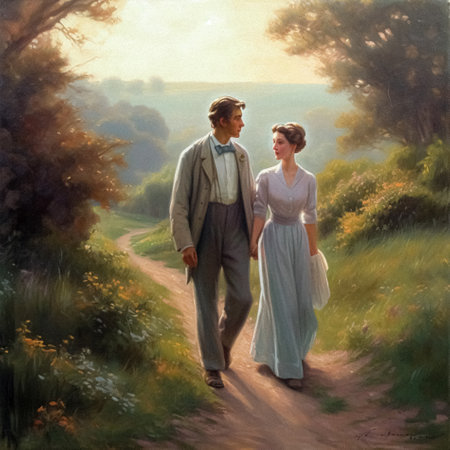 Oil style fine art painting of romantic vintage couple in the English countryside, country nature in soft pastel colours, evoking a sense of love and natural beauty, printable art design