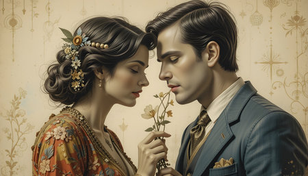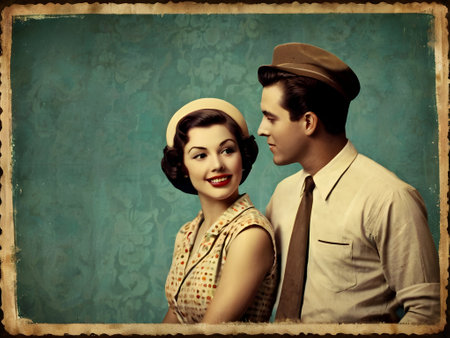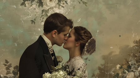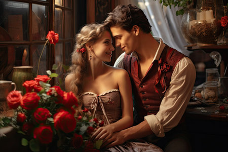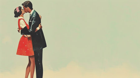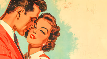 A romantic couple embrace in a vintage bedroom, surrounded by roses and retro decor, evoking nostalgia and love.