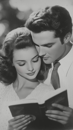 Couple sits with books resting together in nostalgic retro lifestyle scene with sepia effect.