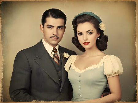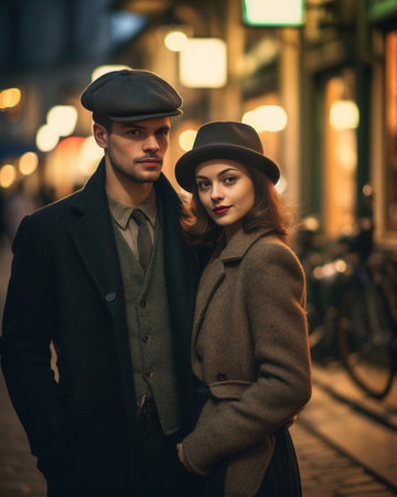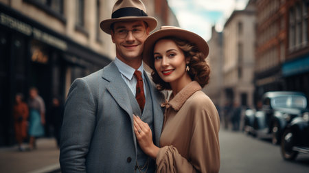 A stylish couple, dressed in formal vintage fashion reminiscent of the 1940s, walks hand-in-hand down a cobblestone street. The man wears a pinstripe suit and fedora, while the woman wears a tweed jacket, floral skirt, and gloves, with a vintage car parked in the background.