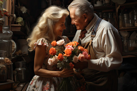 Smiling happy senior couple with fresh flowers. concept of love