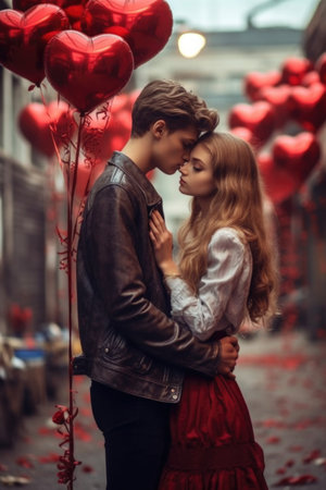 Beautiful young couple spending time together while celebrating Saint Valentine's Day with gift box in hand and air balloons in shape of heart. AI Generated