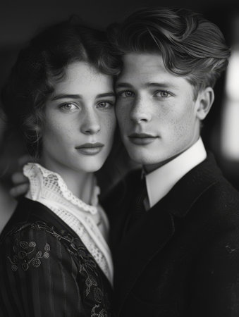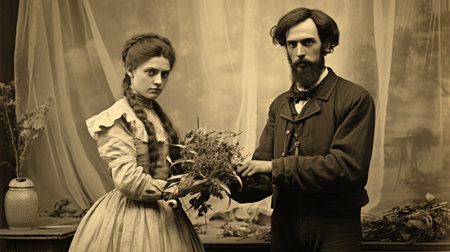 Vintage black and white portrait of a married couple-a man and a woman with concentrated expressions. Sepia, aging effect, scuffs. The atmosphere of the past, retro style.