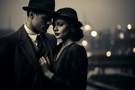 A couple from the 1920s against the background of a city, black and white