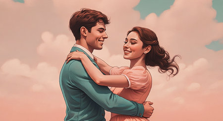 This artistic image features a romantic silhouette of a couple against a soft heart-patterned background. Perfect for capturing the essence of love and intimacy.