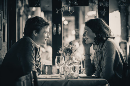 Romantic couple enjoys a delightful lunch at a charming restaurant, engaging in meaningful conversation and sharing smiles in a cozy atmosphere