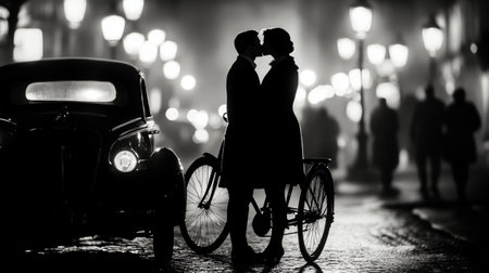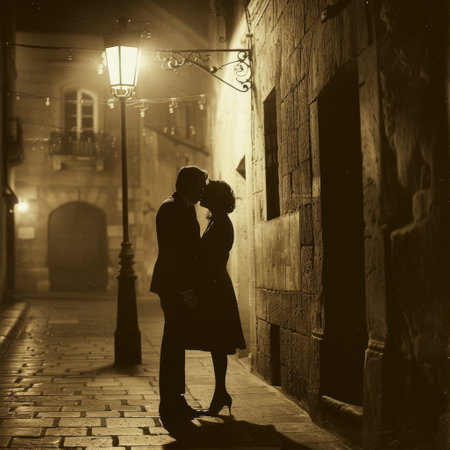 Romantic shadows of a couple embrace beneath a street lamp at night, creating an intimate and atmospheric scene