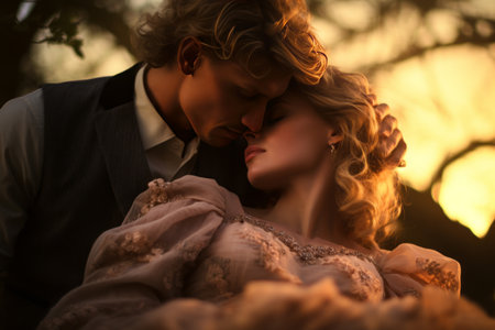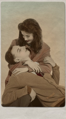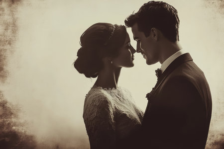 Romantic retro couple in tender embrace with soft gaze vintage style with sepia effect