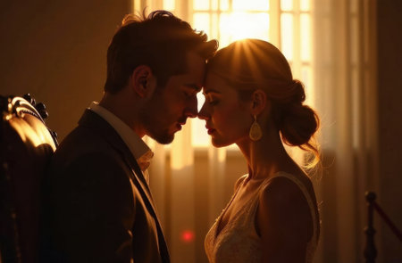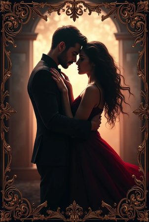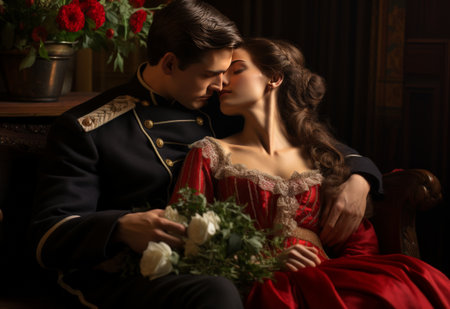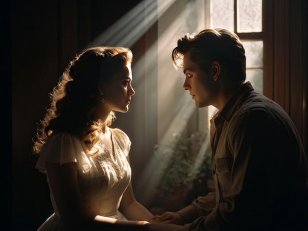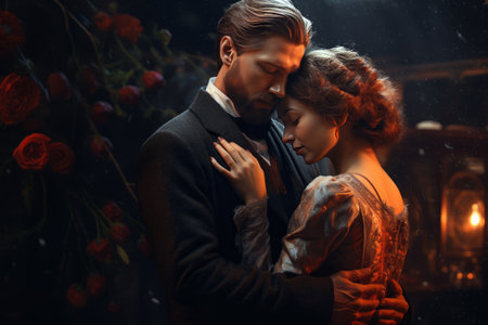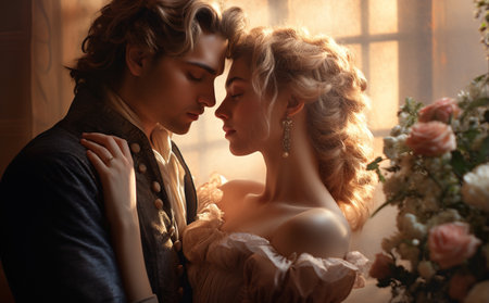 Couple gazes into each other eyes with passion and elegance. Vintage setting highlighted by dramatic lighting creates an atmosphere of romance. Concept of fashion, elegance, vintage aesthetics.
