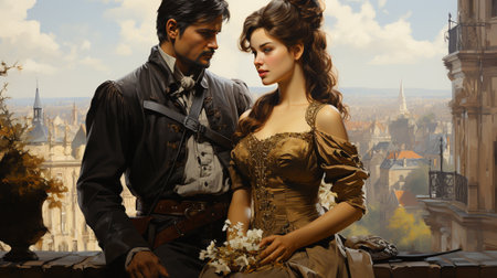 A couple's love transcends time as they stand under the open sky, dressed in elegant historical clothing, with a majestic building in the background