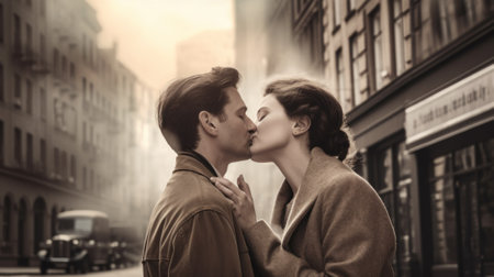 A man and a woman kissing in the street. Generative AI image.