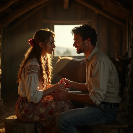 Young couple sitting in the barn at sunset and looking at each other