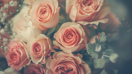 A stunning close-up view of soft pink roses elegantly arranged, conveying feelings of love and tranquility, perfect for celebrations or floral art themes.