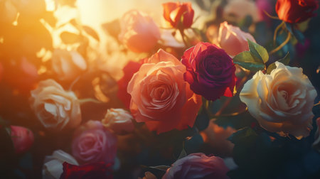 A high-quality image of a lush rose bouquet with various colors, surrounded by soft, blurred background lighting.