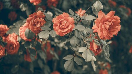 Beautiful blooming roses in the garden. Vintage toned image