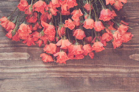 Bouquet of orange roses on wooden board. Spring pattern and copy space. Vintage matte