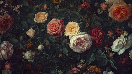 Beautiful garden with an array of blooming roses in various colors, surrounded by lush green leaves. Floral arrangement and nature concept.